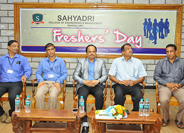 Dr. M R Ravi, KAS, CEO of Zilla Panchayat, Dakshina Kannada graced the function as the chief guest of Fresher’s Day of Engineering 2017-18 batch. Mr. Manjunath Bhandary, Chairman, Bhandary Foundation in his opening remarks spoke highly about the Chief Guest Dr. M R Ravi and asked the students to take inspiration from his achievements. Mr. Bhandary briefed the Guest and the students of the milestones achieved by the institution over the years. He also expressed his plans for the future of Sahyadri which he is determined to achieve and take the institution to getter heights.