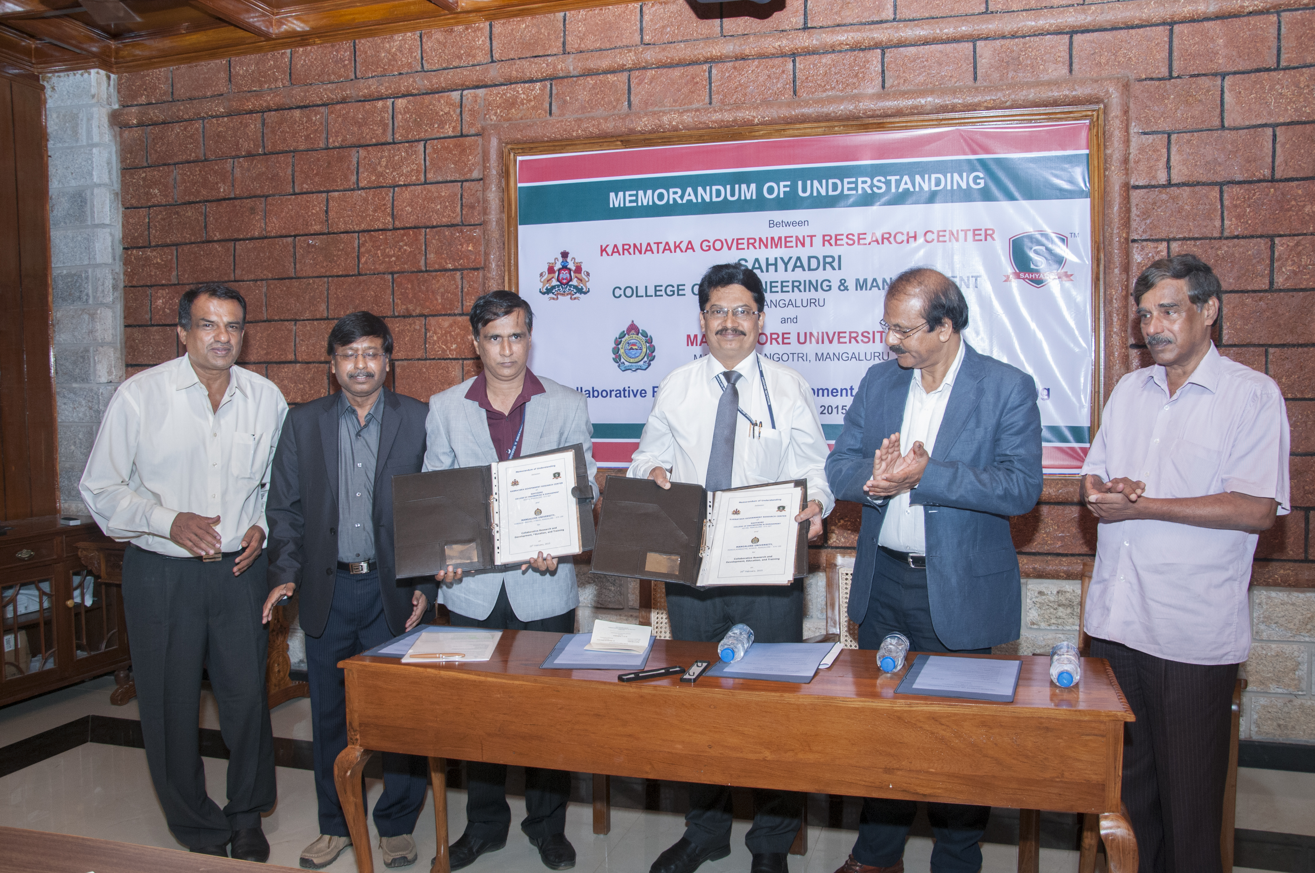 The Karnataka Government Research Center of Sahyadri College of Engineering & Management signed a Memorandum of Understanding (MoU) with Mangalore University for Collaborative Research and Development, Education and Training for the benefit of students, researchers & faculty members with a vision to reach excellence in education and research.